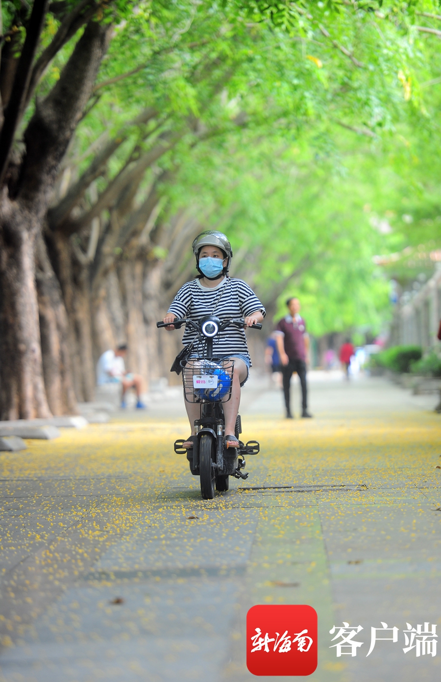 5月4日,騎行的市民從三亞市河東路紫檀樹下經過 。記者沙曉峰攝