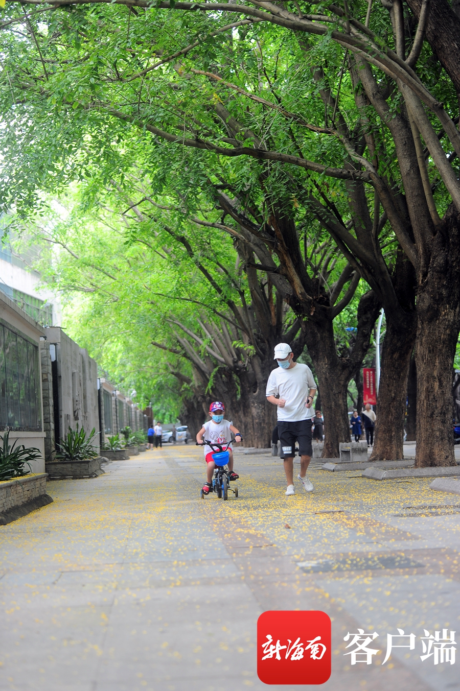 5月4日,市民和孩子在三亞市河東路紫檀樹下玩耍。記者沙曉峰攝