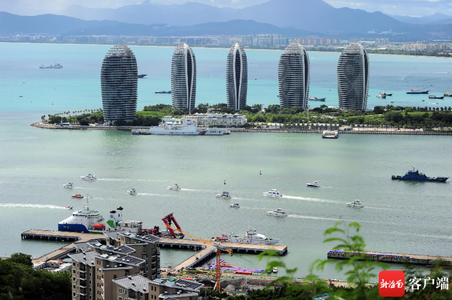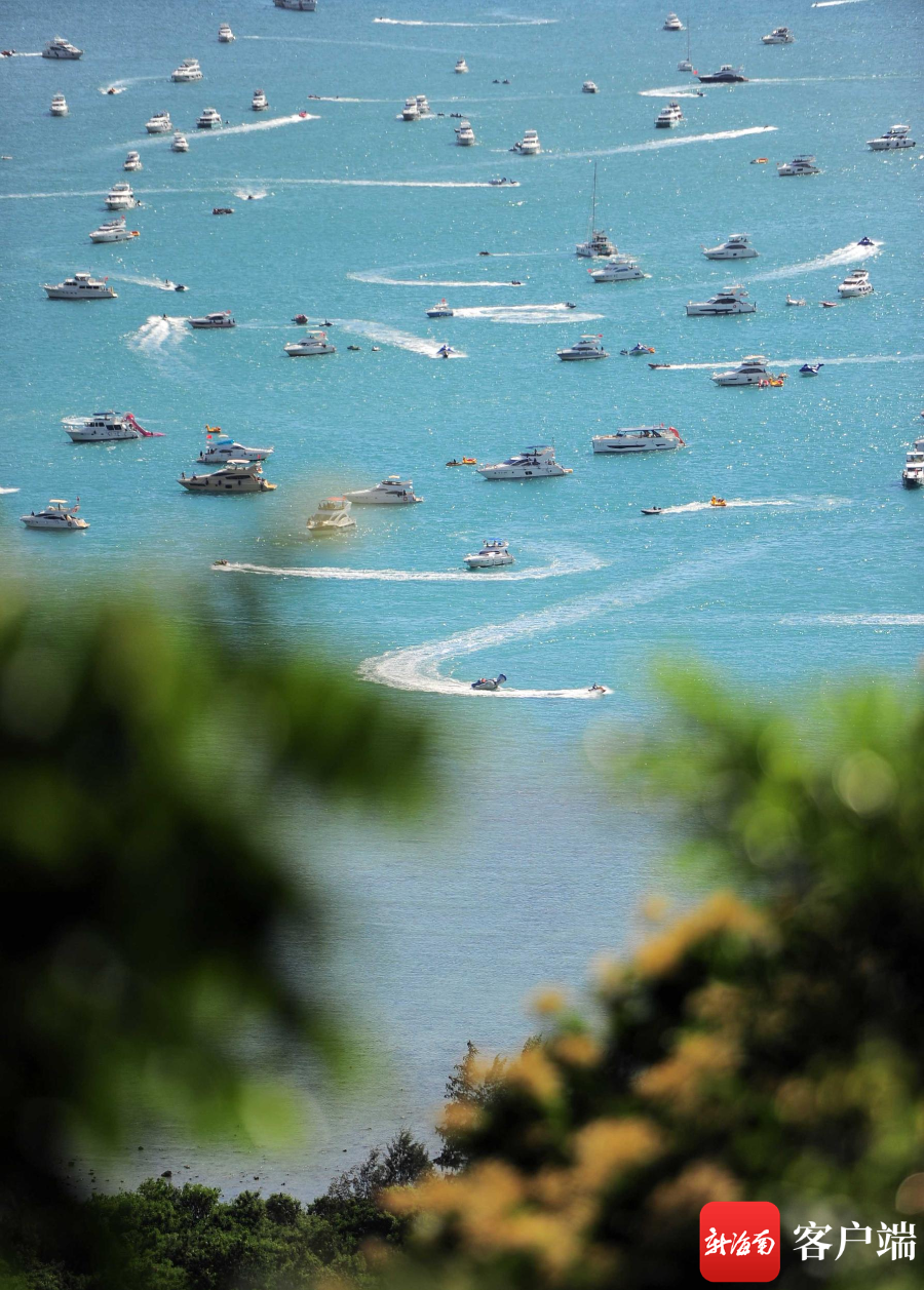 7月14日,游客在三亞鹿回頭景區拍攝游艇“扎堆”出海。記者 沙曉峰 攝