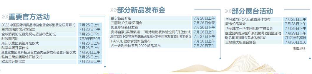 7月25日至7月30日,本屆消博會期間系列活動、論壇、展銷精彩紛呈。來自國內外的2800多個品牌參展、200多個品牌的600多個全球新品首發首秀;線上線下舉辦100余場論壇活動,探討未來消費形勢,洽談供采合作;各展館展區將有美食品鑒、網絡直播、新品體驗、游戲互動、明星合影、美妝授課等多種互動活動,促進展銷采購匹配。