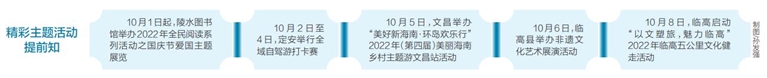 10月5日,省旅文廳將在文昌舉辦“美好新海南·環島歡樂行”2022年(第四屆)美麗海南鄉村主題游文昌站活動,以鄉村旅游消費和鄉村旅游推介為側重點,組織鄉土、鄉創、美食、非遺等市集,融合民族文化活動、鄉村沉浸式體驗和打卡鄉村旅游精品線路等新形式,促進鄉村旅游發展。