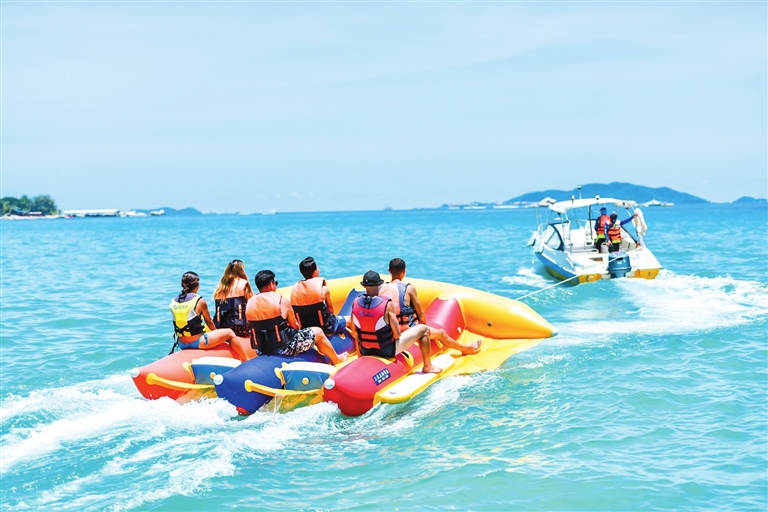 在天涯海角游覽區,游客體驗水上項目。三亞日報記者 陳聰聰 攝