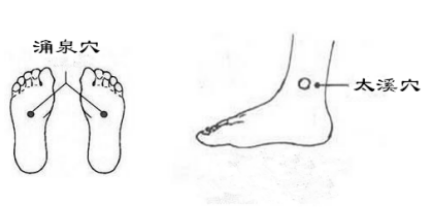 太溪穴是足少陰腎經(jīng)的輸穴、原穴,位于足內(nèi)側(cè),內(nèi)踝后方,內(nèi)踝尖與跟腱之間的凹陷處,有滋腎陰、補腎氣、壯腎陽、理胞宮的作用。涌泉穴是腎經(jīng)的井穴,位于足底卷足時足前部凹陷處,有瀉熱、鎮(zhèn)靜、安神的作用。按摩方法是,一次按壓30下,手指按揉,以微感酸痛為度。
