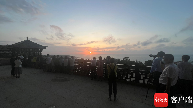 17日18時左右,棋子灣“醉”美海上落日如約而至,蘇先生大呼“好看!”他連忙拿出相機拍下這獨特的美景。海南棋子灣開元度假村大堂觀景臺是欣賞“醉”美海上落日的絕佳點位,和蘇先生擠在此處一同觀看落日的,還有不少游客及攝影發燒友,他們紛紛拿出“長槍短炮”,記錄下此時如畫般的海上落日美景。