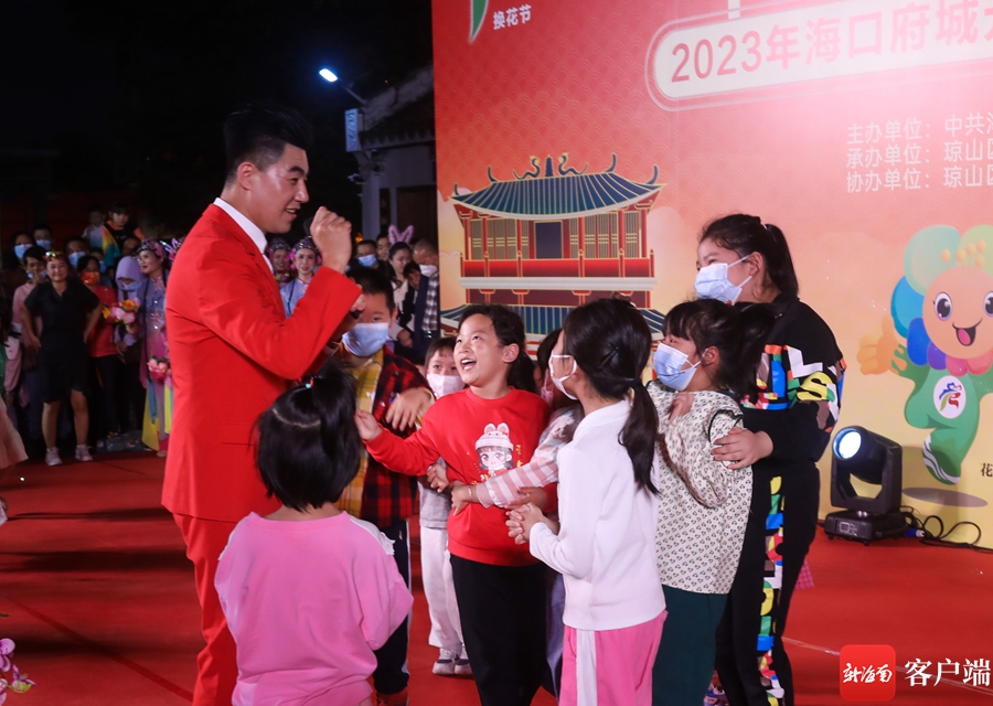 廣場換花舞表演間隙,主持人與孩子們熱鬧互動。記者 姚皓 攝