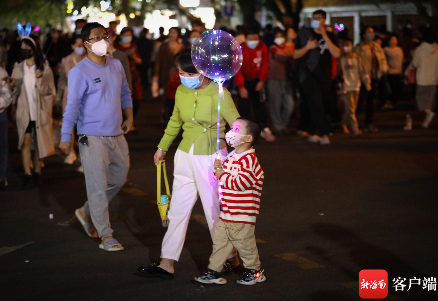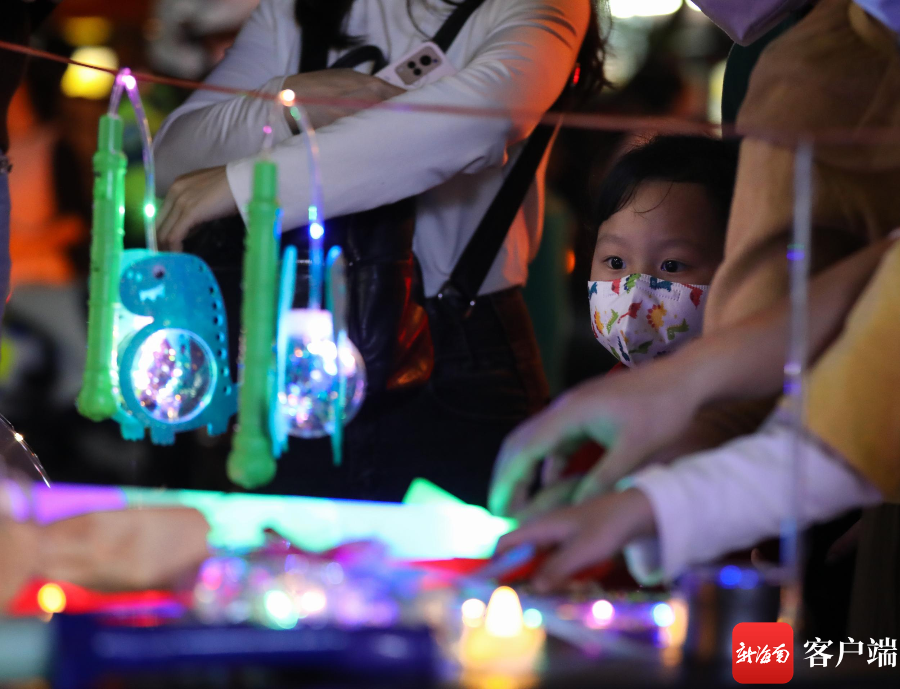 海口府城元宵夜,孩子把玩著玩具燈。記者 姚皓 攝