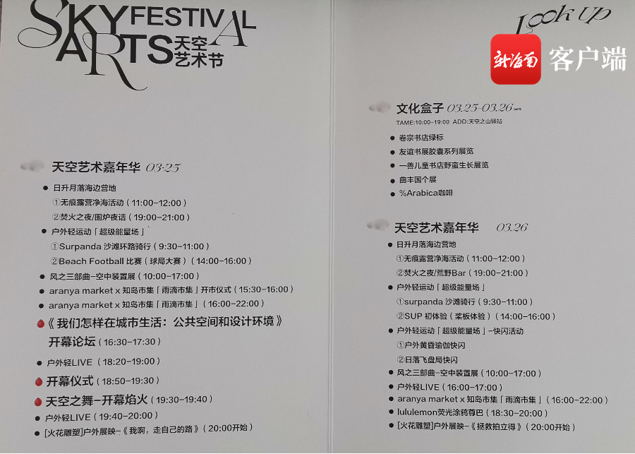 郭少昕表示,天空藝術節期間,將在天空之山室內空間設置文化盒子,承載書展、畫展、快閃商業等內容,戶外空間將呈現音樂現場、阿那亞生活美學市集、露天放映等藝術嘉年華活動。