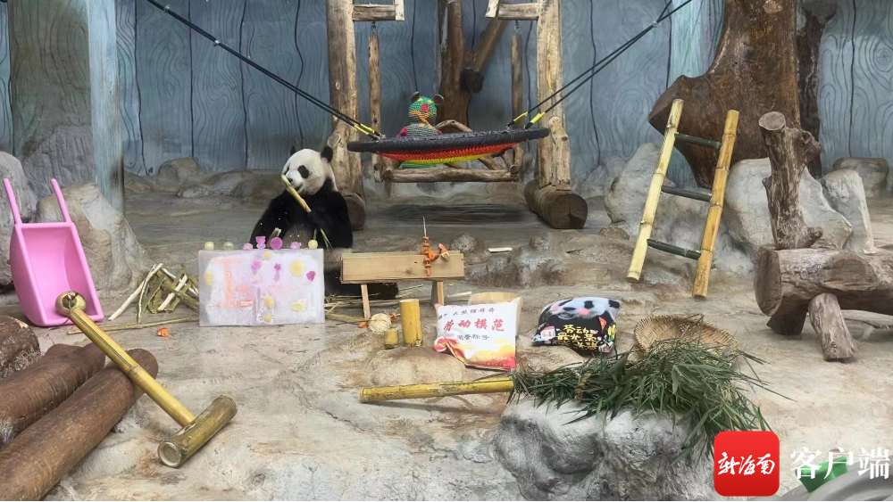 大熊貓貢貢在空調房里“擼串”。海南熱帶野生動植物園供圖