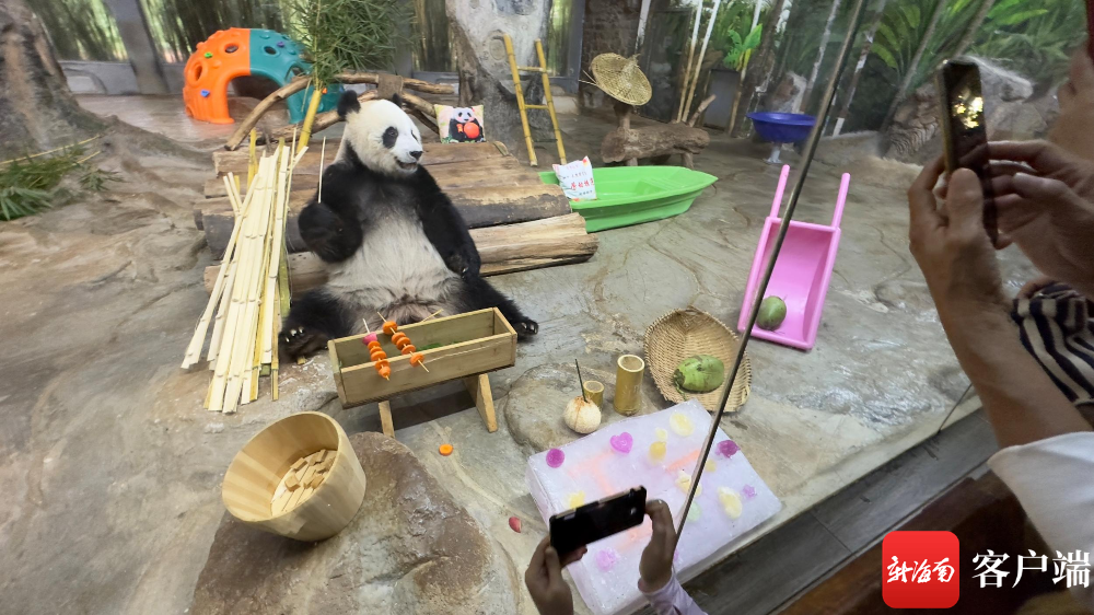 在海南熱帶野生動植物園熊貓館里,國寶大熊貓貢貢和舜舜在“自家庭院”里,邊吃著“燒烤”,邊吹著空調消暑,讓人看得尤為羨慕。