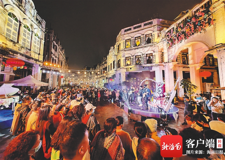 游客在海口騎樓老街的中西合璧市集觀看樂隊演出。 新華社記者 郭程 攝